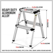 Introducing the HORUSDY Portable 2-Step Folding Ladder, designed for convenience and safety. With its lightweight aluminum frame, this ladder is easy to carry and transport. The anti-slip surface and extra-large non-slip rubber feet provide stability and security while working. Its compact size allows for easy storage in closets or RV corners. This versatile ladder is perfect for various tasks, whether in the kitchen, garden, garage, office, painting, camping, or farm. The heavy-duty aluminum alloy construction ensures durability and a maximum weight capacity of 150kg. Get ready to work with confidence and stability on this reliable folding ladder.