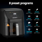 Discover the Devanti Air Fryer, featuring eight automatic cooking modes and a touch-sensitive control panel for effortless operation. Its 360-degree airflow ensures even cooking, while the large transparent window and interior lights offer easy viewing. Complete with a convenient timer, it's the perfect addition to any kitchen.