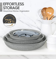 SAVES 75% SPACE - Free up valuable cabinet space with these stackable non stick pans, designed to reduce kitchen clutter by up to 75%. Ideal for small kitchens, campers, or any compact space, they keep your cookware neatly organized without compromising functionality.
