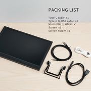 The monitor, Type-C and USB-A cables, Mini HDMI cable, and adjustable bracket.