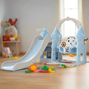 Keep your toddlers entertained with Keezi kids' 5-in-1 slide and swing set. Your kids will have so much fun and stay physically active with our play set. It comes with a long slide, ring game, safe swing, basketball hoop and a bonus ball and pump, giving your child unlimited hours of fun and engaging play. Not just fun, but your kids' concentration skills will also improve with basketball and ring game. Crafted from durable, high-density polyethylene, and non-toxic material, this fun-filled slide and swing set has a U-shaped stable base with water infusion design that increases weight holding capacity, improves overall stability, and prevents tilting. Additionally, it has wide, non-slip, gapless steps, secured one-piece swing hanger, smooth rounded edges, firm-grip handles, and a safe landing slide, ensuring your child's safety while playing. What's most exciting about this play set is storage area behind the steps where you can store your kid's toys. You can also use this play set both indoors and outdoors. Furthermore, our kids' slide set is easy to assemble, thanks to its user-friendly. This 5-in-1 play set makes an incredible present for your kids. Purchase now!