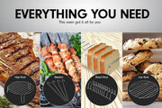 Package includes Stainless steel extender ring, low rack, high rack, tongs, bread rack, skewer & operation manual.